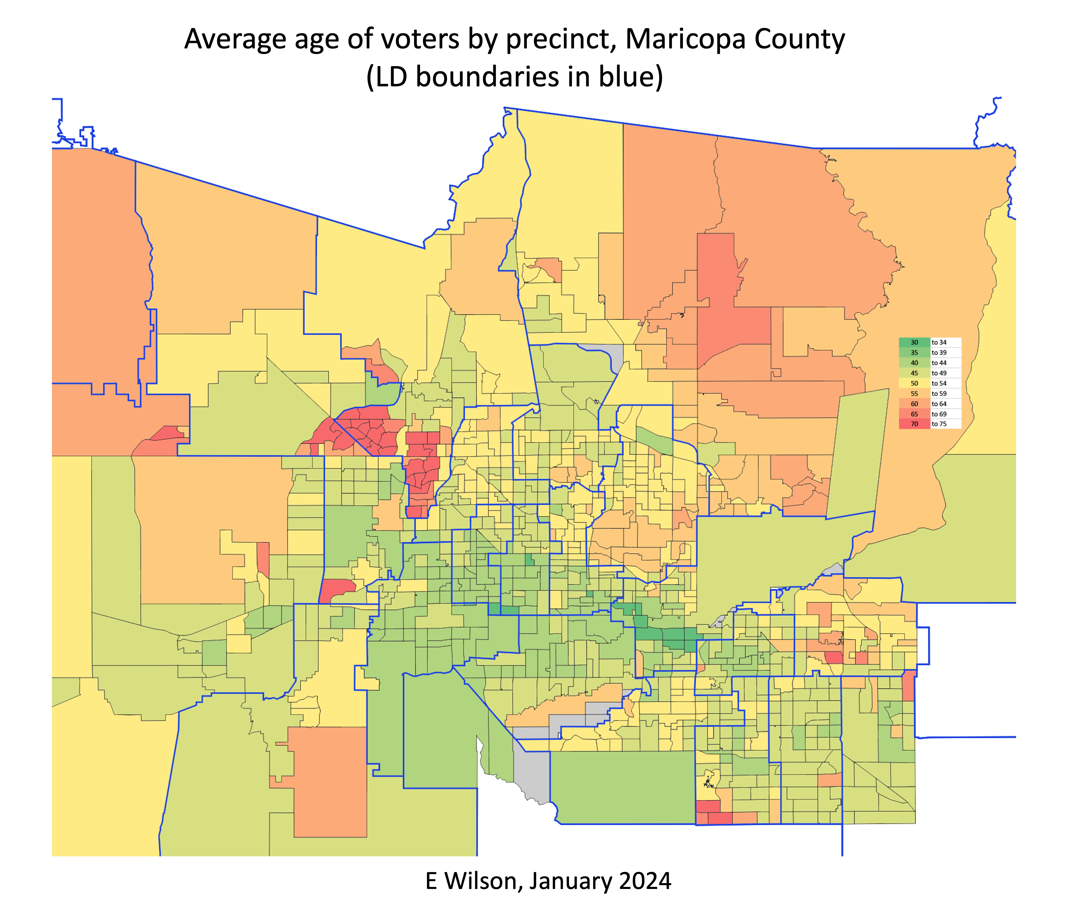Here is an approximation of the average age of voters in every precinct in Maricopa County. Before you click this countywide map and zoom in to find your precinct, consider a few interesting facts about the County’s 906 precincts.