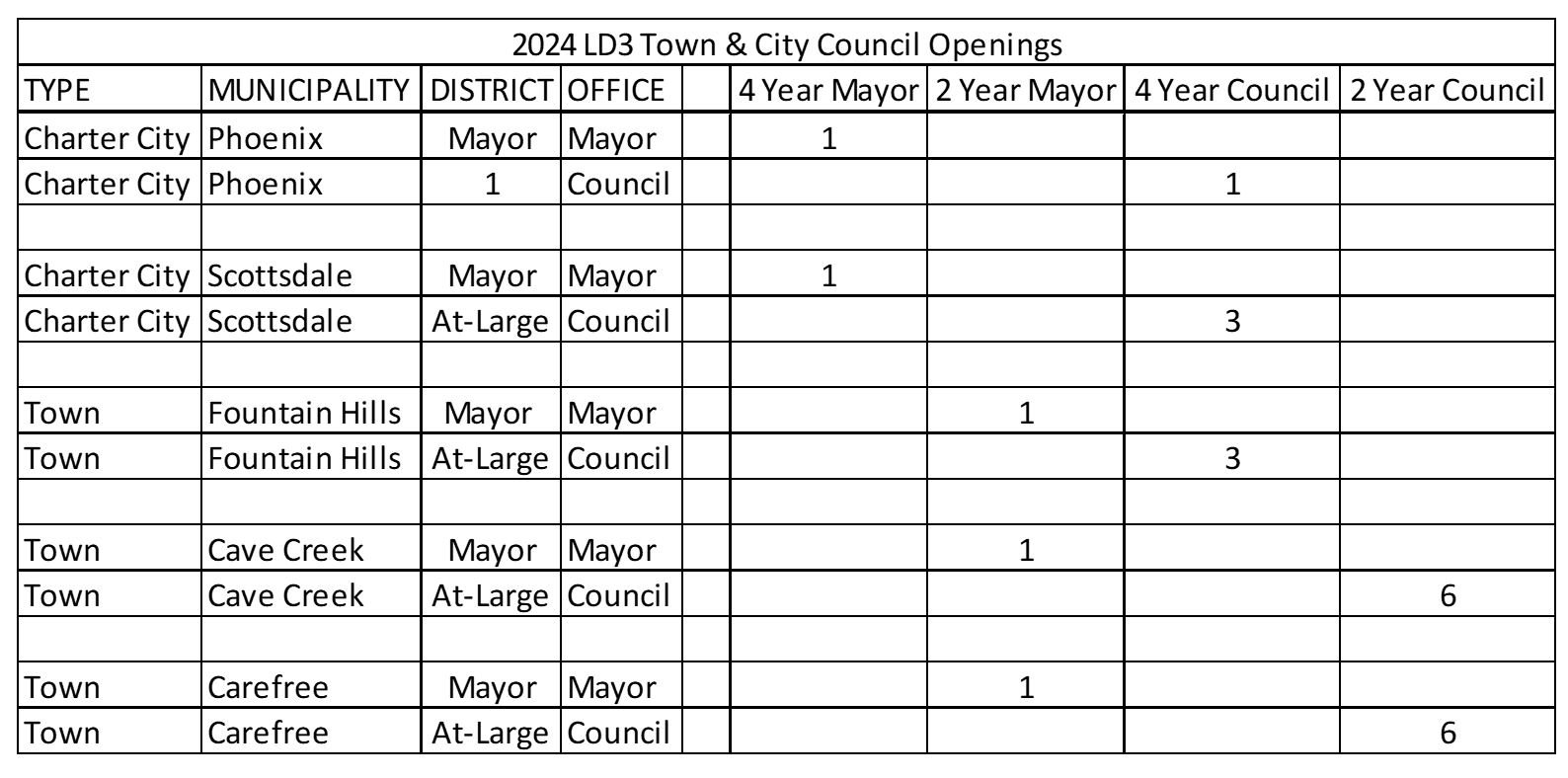 Downballot contests are basically every race except the one at the very top. In 2024, we are expecting considerable activity around Town and City Councils. There are 95 seats open across Maricopa County.
